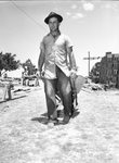 Texas Christian University (T. C. U.) football player Stumpy Owens pulling a wheelbarrow.