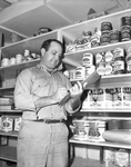 Texas Christian University (T. C. U.) football player Ray Newton checking supplies in a storeroom.