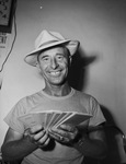 Take A Card -- "Any card," adds Skeet Fincher, "and qualify in the Rockwood golf tournament." Skeet's not really a magician, except when it comes to building up popularity of his annual public course players' competition. Skeet Fincher is pictured here. He is smiling and holding brochures in his hands like a deck of cards and acting like a magician in the Rockwood golf tournament. He is wearing t-shirt and hat. Published in The Fort Worth Star-Telegram morning edition, July 4, 1946.