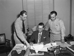 Fort Worth City Manager W. O. Jones signing permit as Lieutenant Commander. B. A. Crisman, Navy (left) and Major E. E. Pegau, Marine Corps (right) look on.