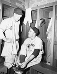 Two new players joined the Fort Worth Cats: Bobby Gorbould, left, and Eddie Snider. Gorbould is a 27-year-old infielder from Canada. Eddie "Duke" Snider is a 19-year-old, left-handed hitting centerfielder from California. He joined the team after serving in the military. The men are in the clubhouse getting ready for a game on the road against the Dallas Rebels. Gorbould is standing in front of his locker with the front of his uniform unbuttoned. Snider is sitting on a bench lacing up his cleats.
