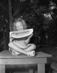 Holiday Delight -- A shady seat and a sugary slice of cool watermelon -- that's a Fourth of July celebration in itself for Barbara Ann Koonce, the 5-year old, blue-eyed, blond daughter of Mr. and Mrs. W. C. Koonce of 644 Sandell. Barbara is shown seated on a table, smiling and holding a quarter slice of a large watermelon. Published in The Fort Worth Star-Telegram evening edition, July 4, 1946.