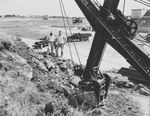 Texas Christian University (TCU) parking space expansion. John Polzin of Taylor, Texas and Howard Grubbs, director of athletics watch a giant steam shovel scoop out the hillside where the parking lot extension will be. They stand on a hill behind and left of the Shovel. Behind them are trucks a section of the bleachers. Published in Fort Worth Star-Telegram, morning edition, July 7, 1946.