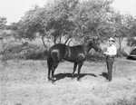 Stamford Quarter Horse Prize Winners -- There were some outstanding horses last week at the official American Quarter Horse Association show at the Texas Cowboy Reunion at Stamford. J. O. Hankins of Rock Springs with his first prize aged mare, Nettie Hill, that also was champion mare of the show are pictured here. J. O. Hankins is standing near Nettie Hill, wearing a cowboy hat and holding the mare's rein. Published in The Fort Worth Star-Telegram morning edition, July 7, 1946.