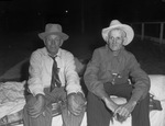 When Old-Timers Gather -- Some of the pioneer West Texans seen by the Chuck Wagon Gossiper at the Texas Cowboy Reunion at Stamford this week. Here are J. L. Sypert of Lamesa, who has lived in that area 31 years (left) and Gus Key of Throckmorton, who has lived in Throckmorton County 53 years. Both men are wearing pants, shirts and hats and sitting on a cot. Published in The Fort Worth Star-Telegram morning edition, July 6, 1946.