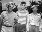 The 1946 Abilene Invitation Golf Tournament is being held in Abilene, Texas. Competing for the trophy, left to right, are Raymond Marshall, Bill Davidson, and G. C. Osborne Junior. Mr. Marshall, of Lubbock, Texas, is dressed in a fedora, golf shirt, and trousers. Mr. Davidson, of Odessa, Texas, is wearing a striped shirt and trousers. Mr. Osborne, of Abilene, Texas, is dressed in a flat cap, plaid shirt, and trousers. They are all standing next to each other and pose for a picture. Published in the Fort Worth Star-Telegram.