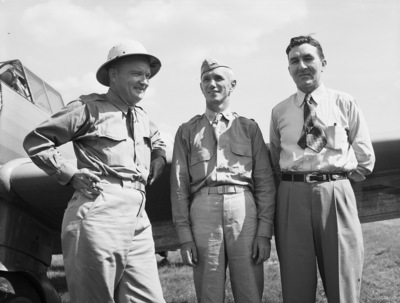 Hicks Field. Left to right, Major B. S. Graham, Major J. R. Morgan and Major W. F. Long, Dallas. Three military men standing in front of a military aircraft. The man on the left and the man in the middle are wearing military uniforms. The man on the right is wearing civilian clothing--pants, white dress shirt and a tie. FWST CLIPPING: Army Man Lands, Looks, Says It's Good. It was inspection day at Hicks Field Monday. Fort Worth Star-Telegram Morning Edition 1940-07-23.