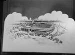 Texas Christian University (TCU) expansion. Copy of architect's drawing of TCU Stadium. The improvement projects include beautification and enlargement of parking space. The rendering is on a poster with cut-outs that are in the form of clouds. Published in the Fort Worth Star-Telegram morning edition, July 7, 1946.
