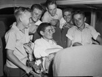 State Junior Golf meet. San Antonio, Texas. Bobby Gilliam, Kenneth Wade, Doyle Gilliam and Albert Waddle, back row, Left to right: Wendell Waddle, left, and Lawrence seated, are pictured huddled in a bus, en route to the State Junior golf meet in San Antonio. Each of them are smiling. Published in the Fort Worth Star-Telegram morning edition, July 7, 1946.