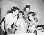Candidates for the Brooklyn baseball trip to see the Dodgers are, left to right, Bobby Mims, Raymond "Rickey" Rowe, Roger Toler, and Howard Lauder. Rowe is getting a number pinned on his shirt prior to heading for LaGrave Field Monday morning Mr. Mims is from Amarillo, Texas. He is wearing a button-up shirt with cuffed sleeves and jeans. Mr. Rowe is from Dallas. He is wearing a button-up shirt. Mr. Toler is from San Antonio, Texas. He is dressed in a striped t-shirt. Mr. Lauder's hometown is Amarillo, Texas. He is dressed in a short sleeve shirt.