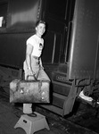 The Texas & Pacific (T&P) Sunshine Special is leaving Fort Worth, Texas on its inaugural run. The train will run from Texas points to New York City, New York and Washington D. C. Boarding the train for a special trip is Bob Gowan of Graham, Texas. Mr. Gowan is dressed in a t-shirt and trousers. He is carrying a suitcase as he steps onto the train. Published in the Fort Worth Star-Telegram morning edition, July 8, 1946.