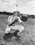 After a two-month search, a winner of the trip to Brooklyn will be announced after a game against the Fort Worth American Legion All-Stars. Among the players who sparkled in the tryout was Chris Hubbard of Austin, Texas. Hubbard is a catcher at the University of Texas. He is squatting on the field with his catcher's mitt on his left hand. He is dressed in his baseball uniform.