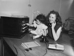Mrs. Hilma Condie is a switchboard operator at the OPA Rent Control Office. Her 2 year old daughter, Charmaine Cheri Condie came to work with her. Charmaine, sitting on a desk, is touching the switchboard while her mother holds a phone to her ear, while sitting in a desk chair. Published in the Fort Worth Star-Telegram evening edition, July 8, 1946.