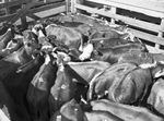 Pens fill up again -- Pens at the Fort Worth Stockyards, largely empty for many days past, were filling rapidly Monday with loads of grass-fed animals like these West Texas range calves, and packer buyers' activities indicated that fresh meat supplies will begin to reach dining tables within a few days. The calves are pictured here. They each have a number attached to their backs. Published in the Fort Worth Star-Telegram evening edition, July 8, 1946. .