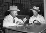 Cowboys In Typical Poses -But Unposed --Two views were caught "on the fly" at the recent Texas Cowboy Reunion at Stamford. One view showing M. L. Jernigan (left) and Bob Kerby (right) playing dominoes. Both of Goldthwaite, snapped by the Chuck Wagon Gossiper as they "herded" some dominoes in the bunkhouse. Both men are seated at a table and enjoying the game. They are wearing hats. Published in The Fort Worth Star-Telegram morning edition, July 9, 1946.