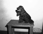 "Hi-Tone Hit Parade" is an eight-month old Cocker Spaniel owned by Mrs. L. C. Mount. The well-behaved black puppy is the son of the famous Champion Benbow's Beau, a twelve-time best in show and twenty times best of variety. Mrs. Mount is hoping Hi-Tone will follow in his father's footsteps as a winning show dog. Hi-Tone is pictured here. He is sitting on a bench, posing for his photograph. Published in the Fort Worth Star-Telegram morning edition, July 14, 1946.