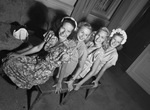 At a luncheon, Left to right, Misses Peggy Joy Thomson, Dorothy Brost, of Bronxville, New York (N.Y.); Vivienne Hanger, and Marguerite Hogsett. All women are wearing dress. Peggy and Vivienne have patterned dress. Peggy and Marguerite are wearing hat. Vivienne and Marguerite are wearing necklace, and Dorothy a brooch. They are shown seated on a bench lined up, smiling, each looking over their left shoulders, and holding the edge of the bench with left hands. Published in The Fort Worth Star-Telegram morning edition, July 14, 1946.