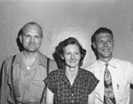 Plan Activities -- Newly-elected officers of the Upsilon Club, co-ed organization sponsored by the Young Men's Christian Association (YMCA), which is planning a program of varied activities to be held at the "Y". The new officers are pictured here. They are, left to right, Joe Porow, president; Mrs. Hugh Eckols, first vice president, and Ray Barnes, second vice president. This half-length portrait showing two men and a woman are standing near a wall and smiling for the photo. Mr. Porow is wearing a shirt and suspenders. Mrs. Hugh is wearing a plaid dress. Mr. Barnes is dressed in shirt and tie. Published in The Fort Worth Star-Telegram morning edition, July 14, 1946.