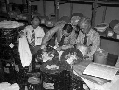 Left to right, Roy Welch, Herb Aldrich, and Henry Reaves, assistants to Tarrant County Democratic Chairman Ward Bailey, prepare election supplies that will go to election judges later in the week. Welch is holding a sack. Aldrich is opening a tin barrel. Reaves is holding a package of ballots. All three men are wearing long-sleeve button-up shirts and neckties.