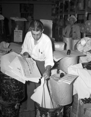 Ward Bailey, Tarrant County Democratic Chairman, preparing election supplies for Precinct 86, River Crest, the largest box in Tarrant County, Texas, for the year 1940. Bailey is surrounded by tin barrels and packages of ballots and printed voting information. He is wearing a long-sleeve button-up shirt, trousers and eyeglasses. An unidentified man is standing in the background, at right. He is wearing a long-sleeve shirt, necktie and a cowboy hat.