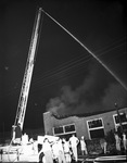 Shown here is a shot of fire that destroyed the International Harvester Company office and warehouse at 601-7 North Main Street, Fort Worth, Texas. Firemen took to the air Saturday night to fight the fire. The tower truck also protected 12,000-volt lines that were directly above the blaze. Published in the Fort Worth Star-Telegram morning edition July 14, 1946.