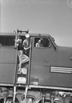 A 16-car train carrying 250 Texas Lions and their wives to Philadelphia for the Lions International convention rolled out of Santa Fe station here Saturday morning. Shown here checking out the fast diesel-engine before the departure are Mrs. Roscoe Gass, left, Dr. Jack Garrison and Mrs. Garrison. All three are from Fort Worth, Texas. Mrs. Gass is standing on the stairs of the train, Mrs. Garrison is seating inside near the window and Dr. Garrison is standing at the train door. Published in the Fort Worth Star-Telegram evening edition, July 13, 1946.