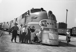 A 16-car train carrying 250 Texas Lions and their wives to Philadelphia for the Lions International convention rolled out of Santa Fe station here in Fort Worth, Texas, Saturday morning. Shown here a few attendees standing beside engine. They are Clyde Thomas, Howard Maddox, Roscoe Gass, Rollie Pray, Mrs. Howard Maddox and Mrs. Clyde Thomas. All six are from Fort Worth, Texas. The engine is showing the name 'Santa Fe'. Published in the Fort Worth Star-Telegram evening edition, July 13, 1946.