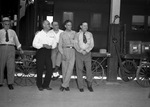 Among the 250 Texas Lions who entrained here Saturday for the Lions International convention in Philadelphia were four district governors, shown before departure time. They are, left to right, Charles H. Dean of Plainview, H. C. Frizzell of Bellville, E. D. Carter of Orange and Doctor (Dr.) E. R. Ammons of Fort Worth. All men are dressed in trousers and full sleeve shirts. Published in the Fort Worth Star-Telegram morning edition, July 14, 1946.