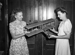 Members of the Hi-Flier Club are meeting in Mineral Wells, Texas to discuss and build model airplanes. In attendance, left to right, are Mrs. Bill Warner and Mrs. Bill Skipper. They are in charge of the officer at Precision Models Incorporated. The women are shown admiring a precision model Curtis CP-10 model airplane. Mrs. Warmer is wearing a floral dress and a necklace. Mrs. Skipper is dressed in a blouse tied in the front and a skirt. Published in the Fort Worth Star-Telegram morning edition, July 11, 1946.