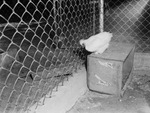 A Japanese Silky Hen at the Forest Park Zoo was robbed of her nest. The sitting hen had two of her own eggs and a rare South American macaw egg in her nest. Zoo Director Hamilton Hittson is on the prowl looking for the thieves. The hen is perched on a box in her cage.