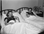 The sisters are sharing the same room in the maternity ward at St. Joseph's Hospital. Mrs. R. B. Brown, right, former supervisor of the maternity ward holds her infant son, Eddy Holmes , born July 9. At the left is her sister, Mrs. C. D. Russell with her infant daughter, Judy Carole, born July 14. Both Moms are smiling and holding their babies in their hospital beds. Published in the Fort Worth Star-Telegram evening edition, July 17, 1946.