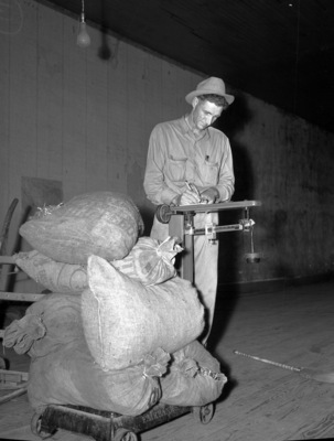 L. C. Bird, buyer, weighing in half a dozen sacks of blackeyed peas. The burlap sacks are stacked on a scale. Bird is writing on a small notepad with a pencil. He is wearing a long-sleeve collared shirt, trousers and a hat.