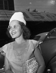 Fort Worth residents have many reasons for wanting to cast ballots in the coming election, and in their minds the important things is that no citizen should fail to take advantage of the right to vote. Miss Mary Paige Thompson, student at Texas University. Thompson says "This is the first year I've been old enough to vote. Of course I'm going to cast my ballot." She is photographed in a dress and hat and carries a purse under her left arm. She is in a parking lot of automobiles. Published in the Fort Worth Star-Telegram morning edition, July 21, 1946.