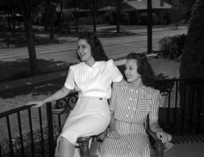 Miss Jean Davis, left, daughter of Mr. and Mrs. Borden Davis, and her house guest, Miss Joan Windsor, of Booneville, Missouri. The two girls attended Lindenwood College at Saint Charles, Missouri, in 1939. They are pictured outside of Miss Davis's house. Miss Windsor is sitting in a chair, wearing a striped dress. Miss Davis is sitting on the armrest of the chair, wearing a blouse and skirt.