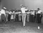 Twice champion Iverson Martin belts a wood shot down No. 14 fairway. As Martin, in a hat and striped pants, tees off, spectators stand behind him. Ivey lost this hole to Royal Hogan's birdie two but came back to capture the hard-fought city semifinals battle, one up 19 holes. Published in the Fort Worth Star-Telegram morning edition, July 21, 1946.