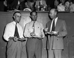 The annual meeting for Soil Conservation and Farm Management is being held in Hillsboro, Texas. About 500 farmers and business men are in attendance, including, left to right, W. C. Davis, Al Williams, and Sterling C. Evans. Unexpected showers chased the convention from the football field into Doughty Hall. Mr. Davis, of Hillsboro, is the chairman of the agriculture committee. He is wearing a striped dress shirt, necktie, and trousers. Mr. Williams, of Hillsboro, is president of the Chamber of Commerce. He is wearing a button-up shirt, necktie, and trousers. Mr. Evans, of Houston, Texas, is president of the Houston Federal Land Bank. He is dressed in a double breasted suit. Published in the Fort Worth Star-Telegram morning edition, July 22, 1946.