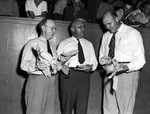 The annual meeting for Soil Conservation and Farm Management is being held in Hillsboro, Texas. About 500 farmers and business men are in attendance, including, left to right, Frank Craddock, Luther Fuller, and Dudley Dawson. Unexpected showers chased the convention from the football field into Doughty Hall. Mr. Craddock is the secretary manager of the Hillsboro Chamber of Commerce. He is wearing a collared shirt, necktie, and trousers. Mr. Fuller is a general farm product agent. He is dressed in a button-up shirt, necktie, and trousers. Mr. Dawson is the manager of the agriculture department at Hillsboro Second National Bank. He is wearing a dress shirt, necktie, and trousers. The three men are shown inspecting ears of corn. Published in the Fort Worth Star-Telegram morning edition, July 22, 1946.