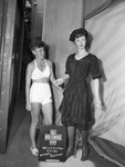 Mrs. Dorothy Hancock, Red Cross swimming instructor (left) inspects bathing suit of bygone era.