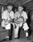 Eddie Chandler, left, of the Fort Worth Cats, and Sig Jakucki of the San Antonio Missions were friendly enough when the picture was made, but the pair of pitching aces will battle when they meet in the game at LaGrave Field. They are in the clubhouse, each with one leg on the bench. Chandler is wearing the Cats' home uniform. Jakucki is dressed in the Missions' road uniform. The jersey has "San Antonio" across the chest and piping down the middle.