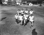 Shown here is Stripling Junior High Bobcats. Left to right, first row, Buddy Moore, Morris Reinhart, Buddy Reusch, Bill Sitton; second row, Cecil Ray, Karl Vasen, Robert Carson and Coach Bill Jenkins. All boys are posed jogging around the field. They are wearing trousers and mostly T-Shirts, caps and having their softball gloves. The Stripling Bobcats won the junior high school softball loop title in the Fort Worth Boys' Club play this summer. Published in the Fort Worth Star-Telegram evening edition, August 2, 1948.