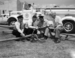 A group of four fire fighters, Fort Worth Fire Department are demonstrating a new piece of fire-fighting equipment. Pictured here from left to right, are Grover Wallis, A. E. Rodgers, John Murphy, and Fire Chief Claude L. Ligon. The new equipment is a hydraulically-operated fire hose clamp, praised as the best yet produced. Mr. Wallis, who has been a fireman in Fort Worth for twenty-seven years, invented the device. He is dressed in his uniform. Mr. Rodgers, city fire department drill master, is dressed in his uniform. Mr. Murphy is wearing a button-up shirt, trousers, and a peaked cap. Chief Mr. Ligon is dressed in striped shirt, necktie, and trousers. There is a firetruck parked in the background. Published in the Fort Worth Star-Telegram morning edition, July 28, 1946.