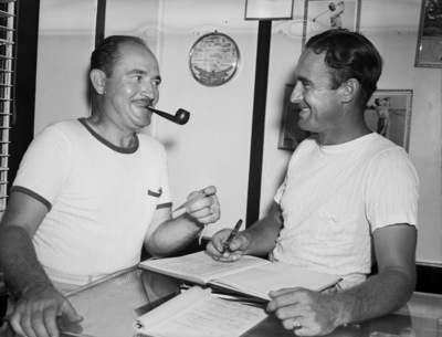 Glen Garden invitation tournament. Hugh Brown, left, getting his starting tag from Henry Ransom, club pro. Brown is seen with a cigar pipe in his mouth as Ransom signs a page book.