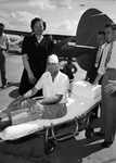 Three residents of Fort Worth, Texas survived a plane crash in Arkansas eleven days ago. They were flown back home to continue their recovery at a local hospital. One of the survivors, Barney Reynolds is being greeted at the airport by his former wife, Mrs. Lillian Reynolds. Mr. Reynolds suffered a fractured jaw and a fractured skull. He is shown sitting on a stretcher, wearing a short-sleeve shirt and trousers. Mrs. Reynolds is wearing a dark, button-up dress. One of the ambulance attendants in the background is Bull Hall. He is dressed in a dark suit. Published in the Fort Worth Star-Telegram.