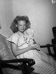 Jeanne Steed. Jeanne is shown sitting in a large armchair and smiling at the camera. She is wearing a striped dress that has large, cap sleeves and a bow on the front. She is also playing with her hands.