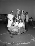 The United States Public Health Service (USPHS) Hospital in Fort Worth, Texas is hosting a Turtle Race. Sponsors with the American Red Cross are placing the turtles in the starting ring. Pictured left to right, on the back row are Mrs. W. B. Todd, Mrs. Kenneth March, and Mrs. Robert I. Jones. Squatting in the front are Miss Nancy Fincher and Miss Betty Coburn. In front of them is a bucket of toy turtles. Letters are painting on the turtles' shells to track the contestants. Mrs. Todd is dressed in a hat, button-up blouse and a skirt. Mrs. March is wearing a floral hat, dress, and a necklace. Mrs. Jones is wearing a hat and a patterned dress. Miss Fincher is dressed in a collared blouse and a skirt. Miss Coburn is wearing a button-up blouse and a skirt. Miss Fincher and Miss Coburn are Junior Red Cross members. Published in the Fort Worth Star-Telegram morning edition, August 2, 1946.