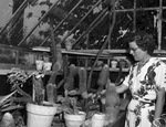Miss Lois Stoner, Victoria, Texas, inspecting a cacti collection. Miss Stoner is shown wearing a floral dress, a beaded necklace and a pair of eyeglasses. She appears to be handling one of the smaller cacti. The table in front of her has an abundance of different potted cacti. Mr. Parker has over 50 varieties in his collection.