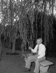 E. G. Parker. Mr. Parker is shown sitting on a stone bench, inspecting the long, drooping leaves of the tree nearby. He is wearing a pair of trousers, a long-sleeve shit, a patterned neck tie and a pair of eyeglasses.