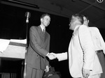 The Tarrant County Democratic Convention is holding a meeting at the First Baptist Church. In attendance, left to right are Brantley Pringle and Stewart W. Hellman. They competed for the position of chairman of the executive committee. Mr. Pringle is shown standing on stage by a microphone, congratulating Mr. Hellman after the votes were counted. Mr. Pringle is dressed in a double breasted suit. Mr. Hellman is wearing a light-colored suit. Published in the Fort Worth Star-Telegram morning edition, August 4, 1946.