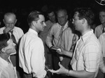 The Tarrant County Democratic Convention is holding a meeting at the First Baptist Church. In attendance, left to right are Hamilton Rogers and Bill Wills. The men are engaged in a good-natured argument at the convention. Mr. Rogers was a Texas Regular leader two years ago. He is wearing a dress shirt, bow tie, and trousers. Mr. Wills is a pro-Roosevelt backer. He is dressed in a short-sleeved shirt with a window pane design and holding a cigarette in his left hand and a match in right hand. Other people are watching them. Published in the Fort Worth Star-Telegram morning edition, August 4, 1946.