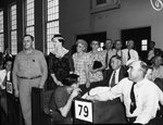 The Tarrant County Democratic Convention is holding a meeting at the First Baptist Church. In attendance, left to right are B. H. Glenn, Mrs. J. C. Reynolds, Mrs. V. S. Brunson, Mrs. Roy Evans, Claude Hamilton, E. C. Powell and H. Lee Johnson. The delegates from Precinct 80 were left standing because no returns had been received. Published in the Fort Worth Star-Telegram morning edition, August 5, 1946.